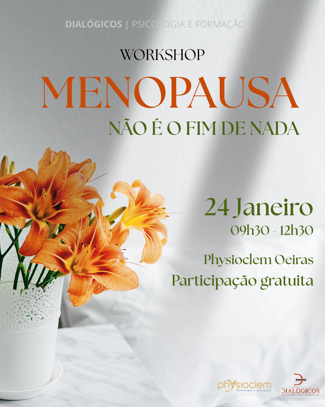 A menopausa é uma transição natural do ciclo de vida da mulher, muitas vezes vivida em silêncio, com dúvidas, desconforto ou sentimentos difíceis de nomear. Este workshop nasce da união entre a psicologia e a fisioterapia pélvi... |